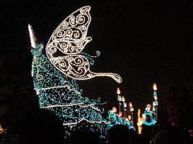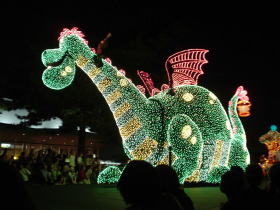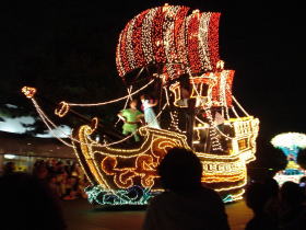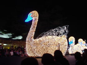 【その1】 【その2】 【その3】 【その4】 さあ、そろそろナイトパレード、エレクトリカルパレードドリームライツの時間です。 ディズニーランドに来たなら見て欲しいものの1つです。 ![]() 先頭をブルーフェアリーが行く。んん〜、綺麗!なんて素敵なんだ! ![]() そこにアリスの乗ったチシャネコの登場。 キラキラ光っていると思えば、目玉だけ光る真っ黒になったり…。 ![]() そこにピーターパン、ウエンディ、そしてフック船長の乗る海賊船。 (忘れてはいけないミスター・スミーも乗っています) ![]() ピートとドラゴン。英語でペチャクチャ言っているのですが、よく分かりません。 時々ドラゴンが鼻からプスーッと煙をはいたりします。 ![]() スワン、スワン♪親であろう白鳥の後ろに子供らしき白鳥が続いています。 ![]() 日本ユニシスの提供するエレクトリカルパレード・ドリームライツでした。 ちなみに中国語では「東京迪士尼樂園電子大遊行〜夢之光〜」と言います。 ![]() パレードも見終わったことだし、そろそろ帰ることに。 今日は本当に楽しく遊ばせていただきました。ありがとう!ディズニーランド! 【その1】 【その2】 【その3】 【その4】 |