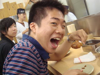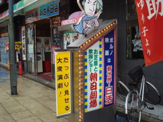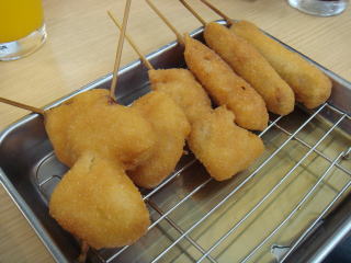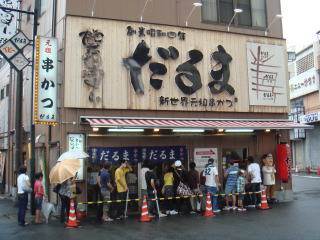 【 その1 】 【 その2 】 【 その3 】 【 その4 】 【 その5 】 【 その6 】 【 その7 】 ちょうど昼時になったけん、ご飯を食べることにした。昼ご飯は僕の希望で串かつ屋~~~。 ![]() ほんまに通天閣の真下にある串かつ屋さん。だるま、という店。 むっちゃ行列ができとったけん、それなりの店なんかなー。 ![]() 初めて来たーー!!ソースの二度づけ禁止は暗黙の了解~。 ![]() 最初に飲み物を聞かれて、数本串かつを注文。初めてで慣れんけん、緊張したー。 でも食べてみると、むっちゃまいうーーーー!!!!嬉しい。 ![]() 熱々が良いけん、ちょくちょく頼んでいく。一本百円から。 豚かつ、たまねぎ、れんこん、うずらの卵、ほたてなど食べた。 一人1500円もあれば満足。からっと揚げたてでおいしい~。ほんまに満足じゃったー!! ![]() 自転車に乗っとる謎の木製ロボ。特に動くような仕掛けは見当たらんけど…なんなんな? ![]() 一昔前の雰囲気が漂っとる映画館。一番左やこ、ものすご大きな文字で「軍鶏」だって。 ![]() テッチヤン。 ![]() ポルノ映画の看板も堂々と光り輝かせてお出迎え。この潔さも大阪ならではなんか? ![]() このポスターはよう分からん。火事防止を呼びかけとんのは分かるんじゃけど。 右側には「油断したらあかんでっ」と言って、赤ちゃんが「バブー、バブー」と言いようる。 そしたら左側には「すぐこんなんなるでっ」と言って、さっきの赤ちゃんが変身して炎に包まれ、「ボホー、ボハー」と言いようる。 むむむ、このポスターにおいての赤ちゃんはどういう存在なんか…考えさせられるなあ。 【 その1 】 【 その2 】 【 その3 】 【 その4 】 【 その5 】 【 その6 】 【 その7 】 |